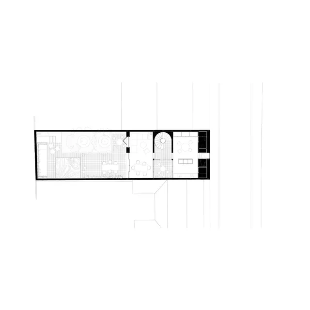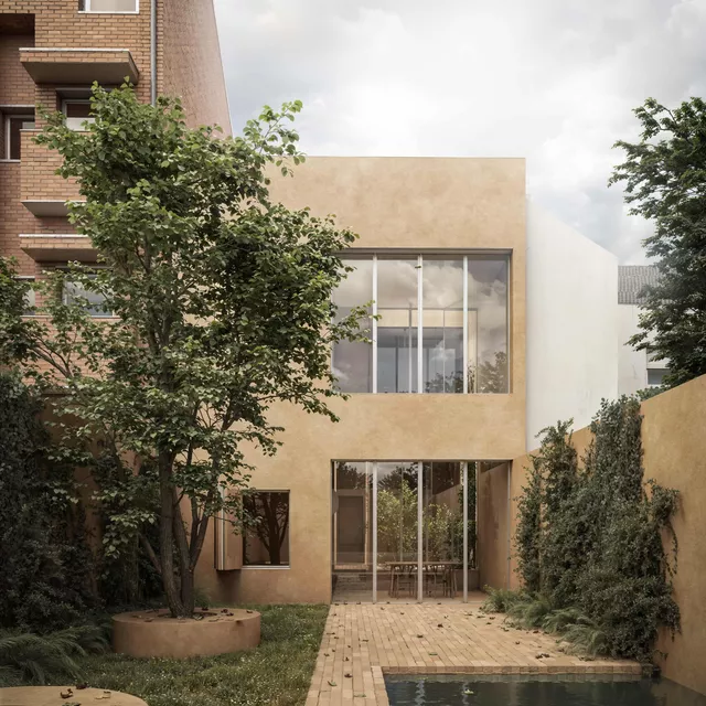 At the rear of the plot, a large garden with abundant vegetation forms an urban oasis. This space not only creates a refuge of silence and coolness, it extends the interior of the home into the outdoors.