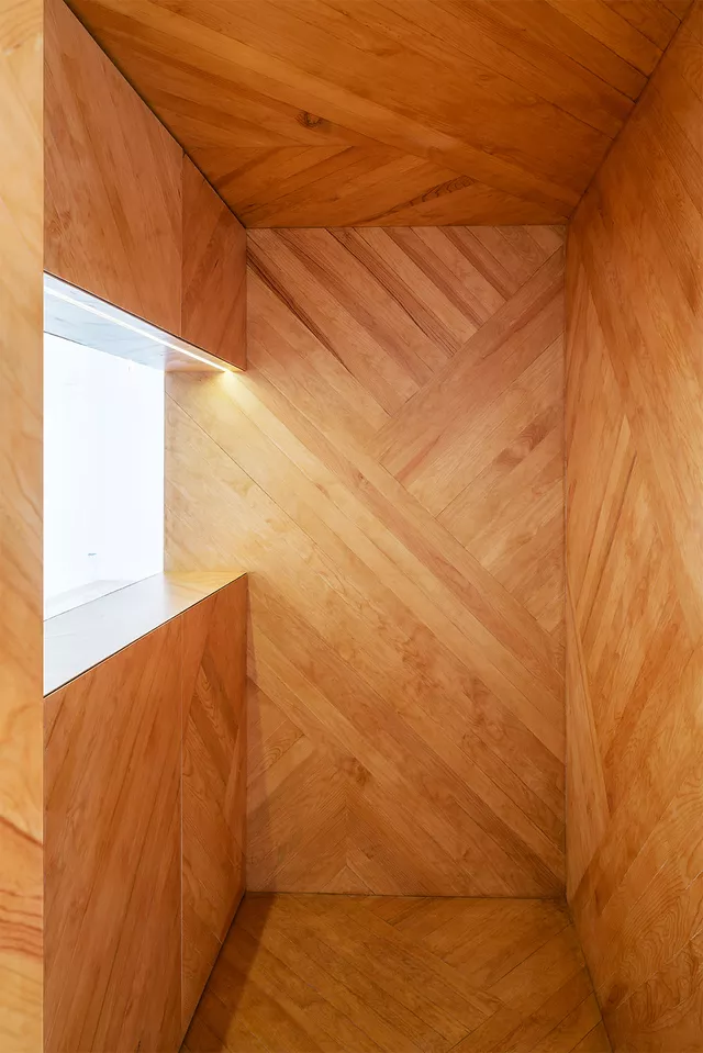 The main house is organised in the former common area, around a reflective recreational space located in the centre of the foyer that achieves the spatial requalification of all the surrounding areas (kitchen, dining room, living room, library, bathrooms, and bedrooms), creating an uninterrupted visual connection between all of these spaces. The foyer is transformed into a pivotal recreational expanse, with a wealth of natural light, forming a spatial extension of all the adjacent rooms.