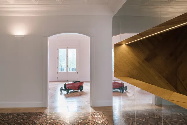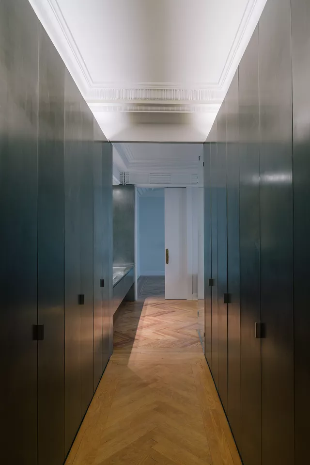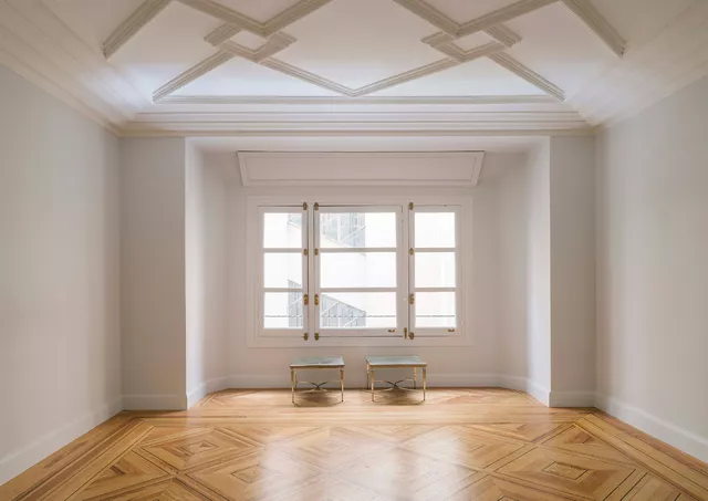 Special treatment of the existing wooden floors, stained-glass windows, mouldings, windows, doors, and walls, as well as the design of certain pieces of furniture/lighting complete the work in this area.