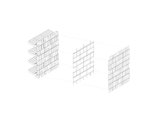 To this end, firstly, the form factor of the building's volumetry offers a reduced façade surface in contact with the exterior, thus optimizing both its cooling and heating. Second, the faceted geometry of the envelope and its reflective capacity minimize incident solar radiation. Finally, the system of radiant concrete slabs is responsible for counteracting the residual heat, guaranteeing well-being and comfort in its interior spaces. As a result, the project proposes an alternative design to the typical office building, usually with an airtight envelope and air conditioning system, in order to opt for a passive strategy in which sustainability, health and wellbeing converge.