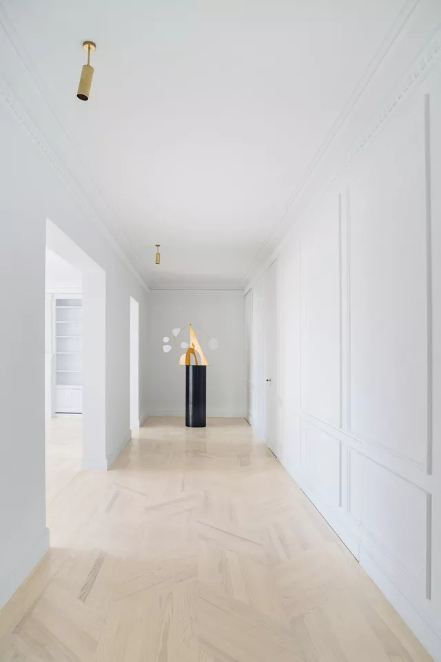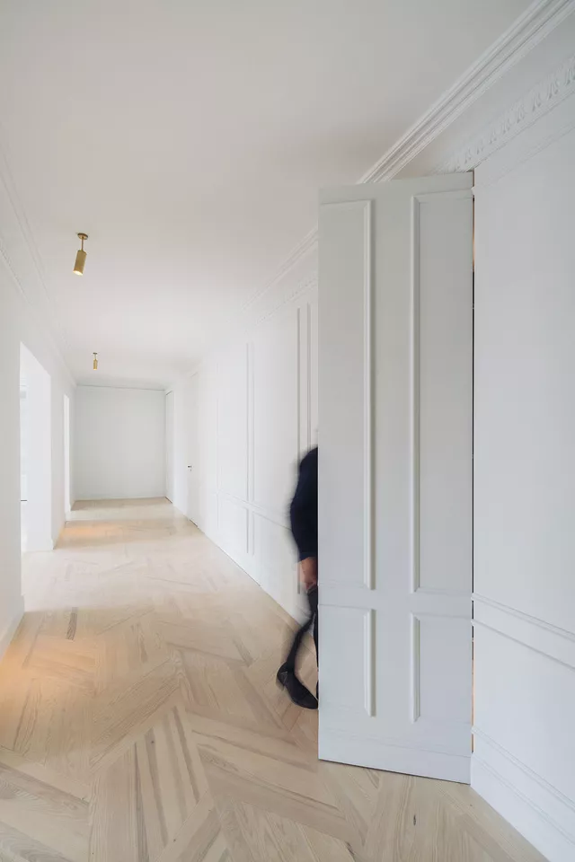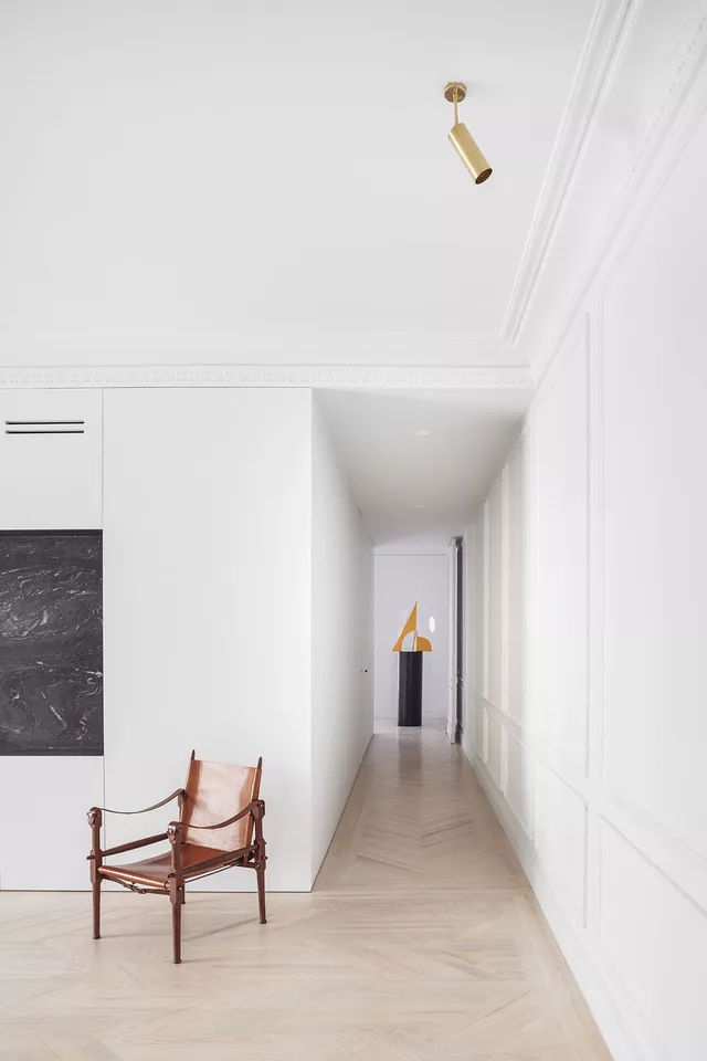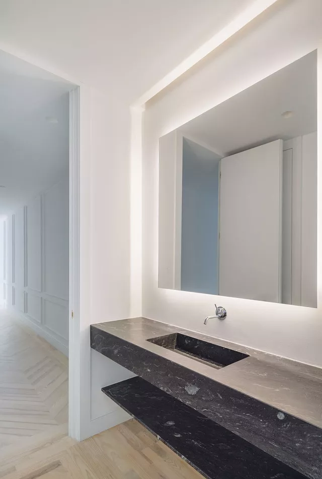 Opting for a contemporary, large, clean, open space, together with respect for the original building elements, generates a new sensitivity that obliges careful design and selection of the rest of the materials for the apartment. The elaborate laying of the floors, the purposeful design of the pieces of furniture and lighting, incorporating fine materials such as stone and brass, complete the intervention and succeed in creating a new atmosphere of a contemporary home that respects the original character of the late 19th century stately building in which it is located.