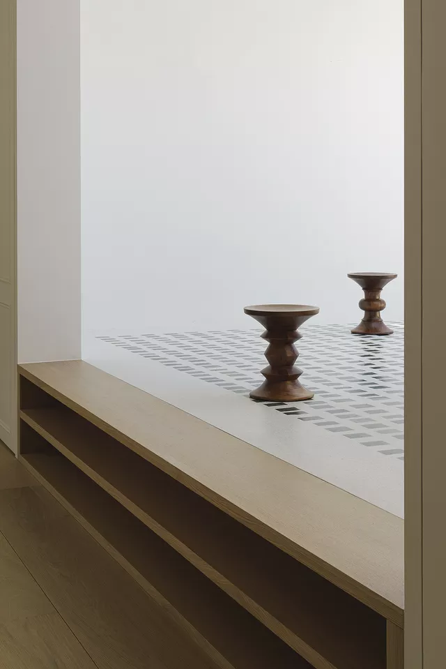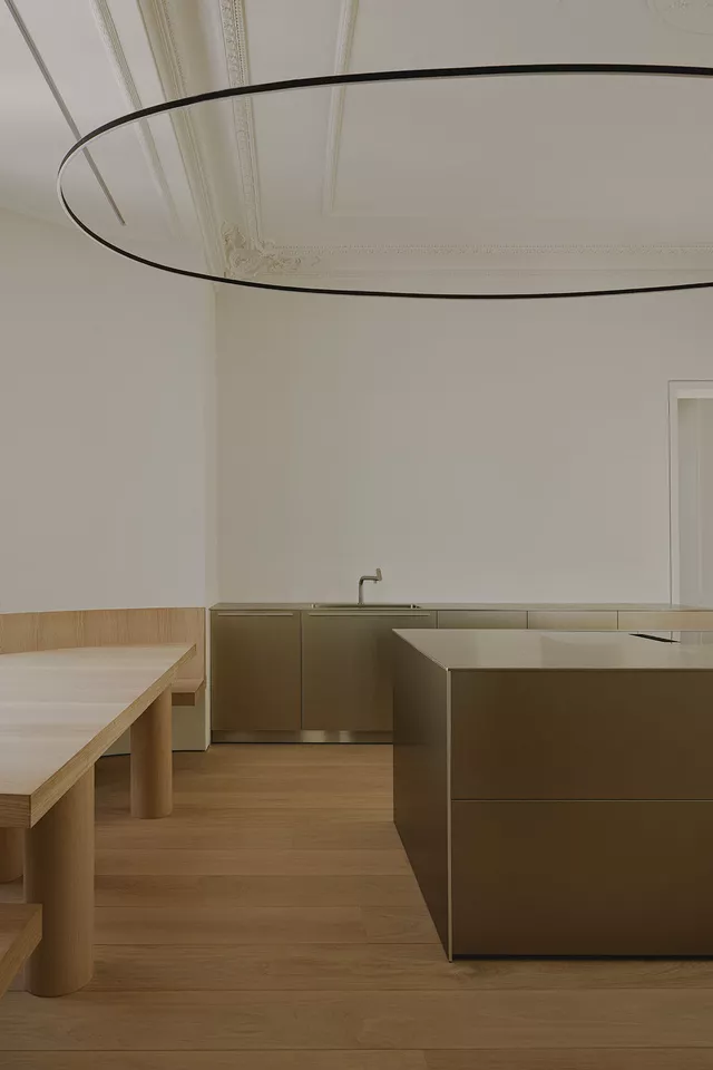 The layout makes the most of the building’s configuration, with rest areas facing the intimate garden space to maximise the quiet, natural lighting, and ventilation the environment provides. Common areas, meanwhile, face the main façade with views of the Madrid skyline, creating large-scale open spaces that replace the original corridors and converge on a kitchen that serves as a nucleus between the two sections.