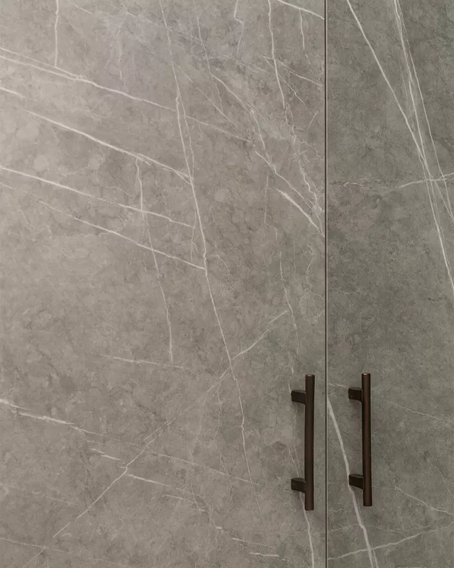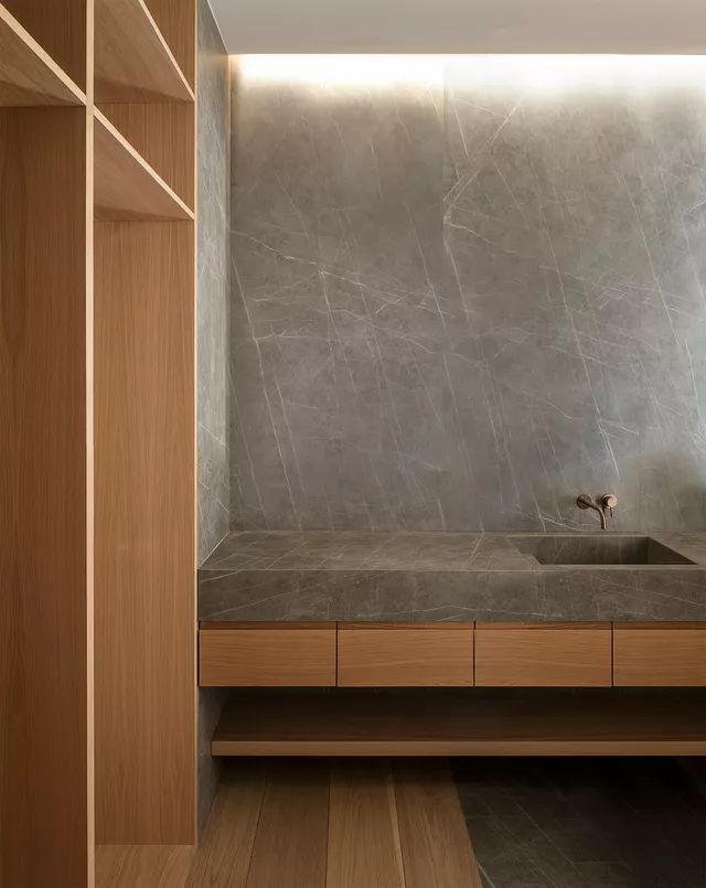 Careful, isolated use of fine materials in furnishing elements designed in black and greenish-grey stone, along with wooden elements in natural oak, combined with metals such as copper and bronze, establish a theme that brings character and quality to the environmental uniformity of the home.