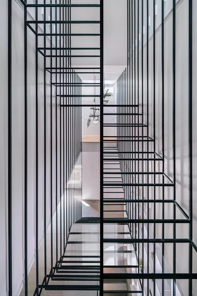 Spatially, a lightweight suspended structure colonises the central space in the home like a tree, characterising the large three-storey space that resolves the house’s vertical communication, acting as a true backbone to the setting, binding spatial, functional and environmental aspects, optimising the interior space in the home. The freshness of the irrigation and moisture from the garden are exploited by introducing them into the diaphanous interior space of the home through the large windows, using the Venturi effect generated by the three-storey central space ventilated at the top by two skylights, that allows the wind to flow through the designed water hanging lamps to dissipate the heat and cool the house naturally in the hot months. The space and the selected materials filter the natural energy present in the site, stores it and redistributes it to provide a thermal indoor ambient and a biological outdoor environment.