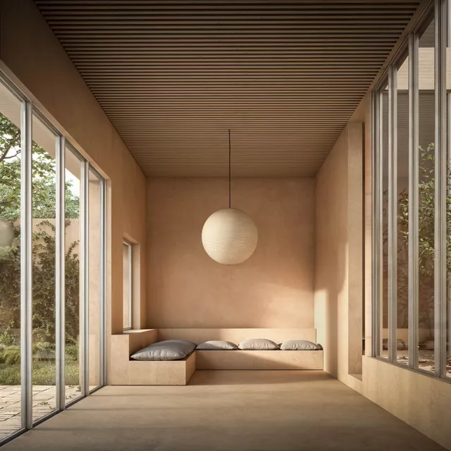 Inside the house, overhead light filters in from the central courtyard. This well of illumination functions as the heart of the home, where all habitable rooms converge, and organises the interior structure.