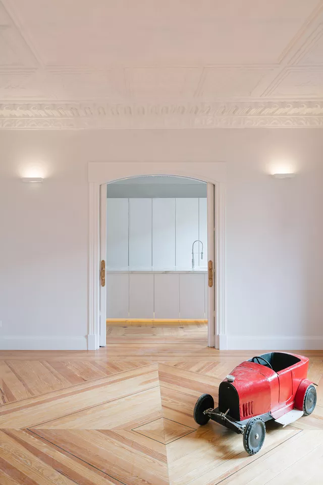 The project entails the challenge of adapting two classic Art Deco turn-of-the-century homes (originally a single dwelling) to the needs of the contemporary home, allowing them to be sold after the renovation either as two independent units or one large luxury residence, without the need for additional work.