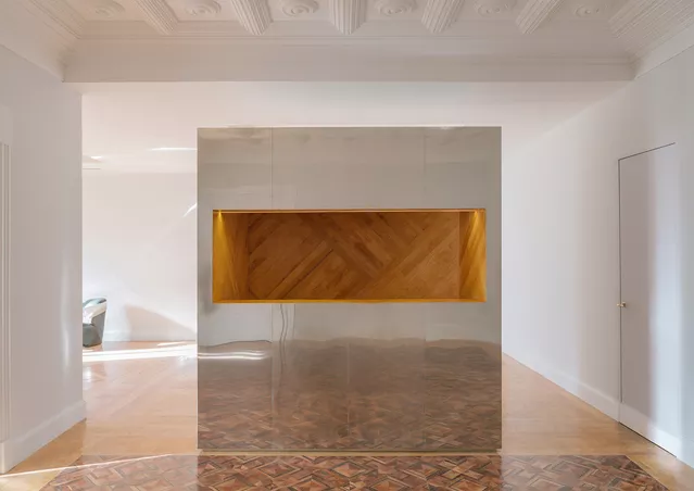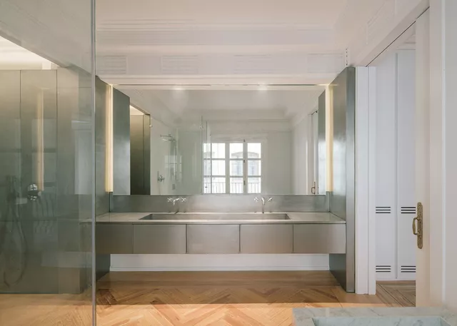 Special treatment of the existing wooden floors, stained-glass windows, mouldings, windows, doors, and walls, as well as the design of certain pieces of furniture/lighting complete the work in this area.