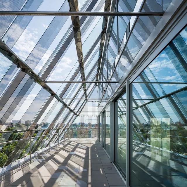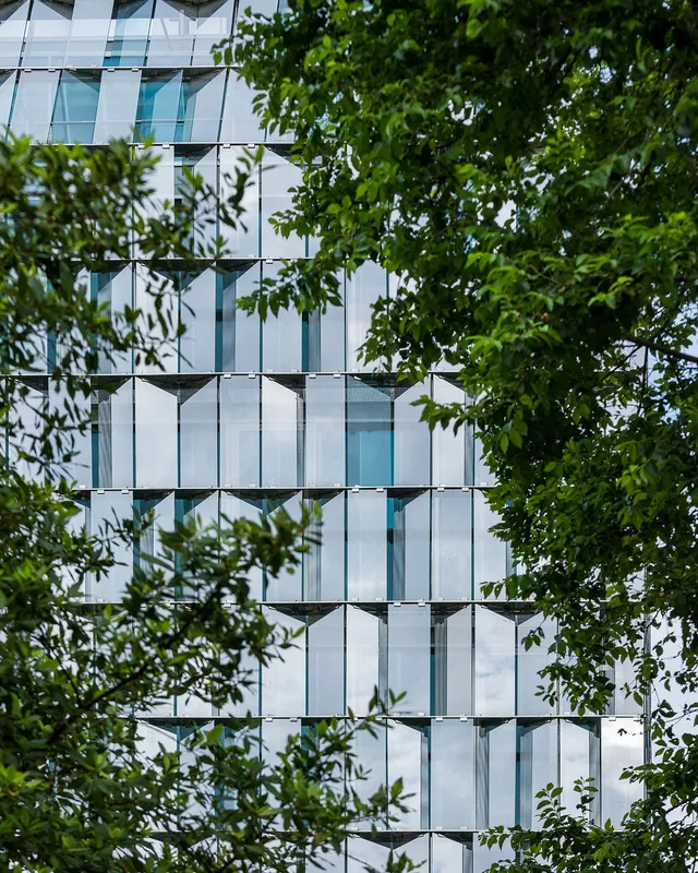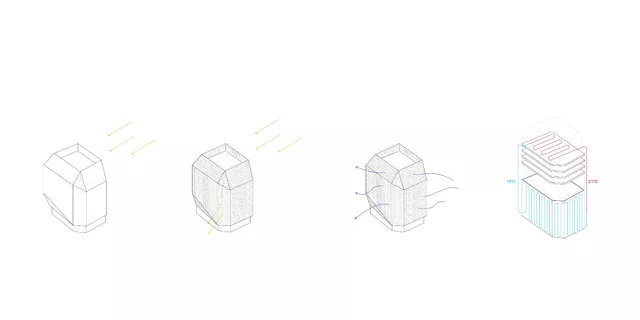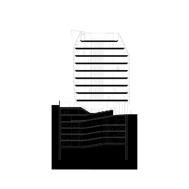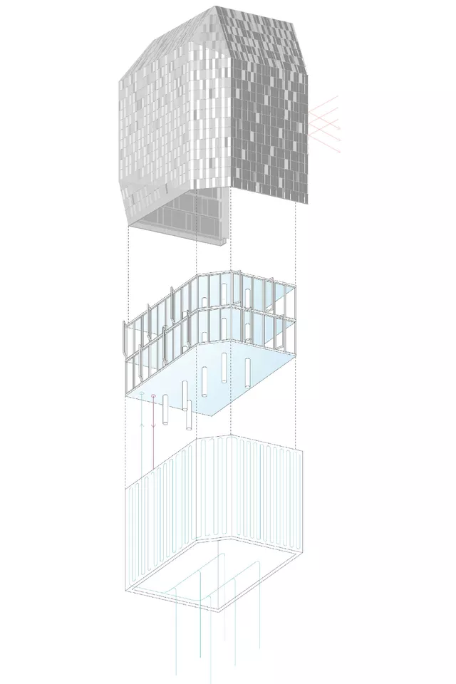 To this end, firstly, the form factor of the building's volumetry offers a reduced façade surface in contact with the exterior, thus optimizing both its cooling and heating. Second, the faceted geometry of the envelope and its reflective capacity minimize incident solar radiation. Finally, the system of radiant concrete slabs is responsible for counteracting the residual heat, guaranteeing well-being and comfort in its interior spaces. As a result, the project proposes an alternative design to the typical office building, usually with an airtight envelope and air conditioning system, in order to opt for a passive strategy in which sustainability, health and wellbeing converge.