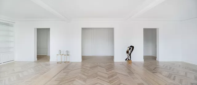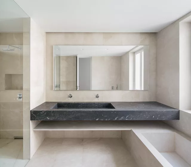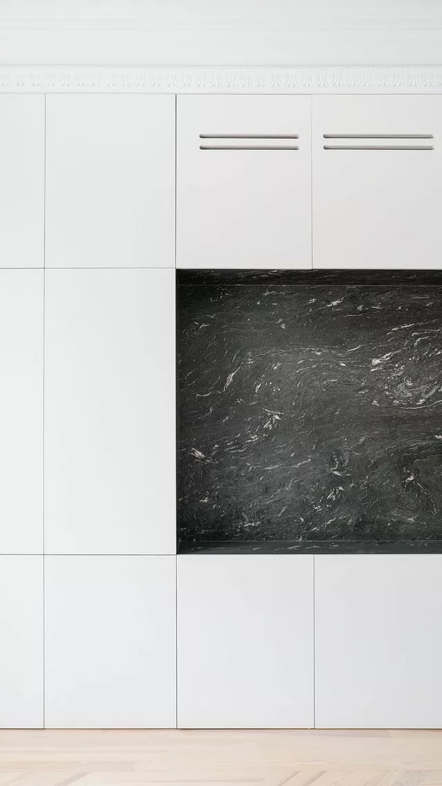 Opting for a contemporary, large, clean, open space, together with respect for the original building elements, generates a new sensitivity that obliges careful design and selection of the rest of the materials for the apartment. The elaborate laying of the floors, the purposeful design of the pieces of furniture and lighting, incorporating fine materials such as stone and brass, complete the intervention and succeed in creating a new atmosphere of a contemporary home that respects the original character of the late 19th century stately building in which it is located.