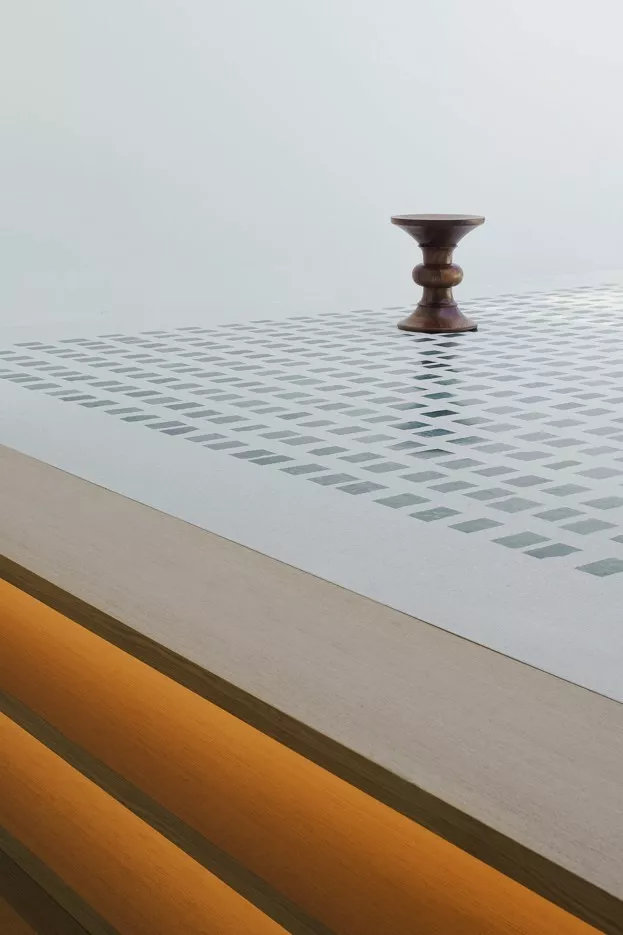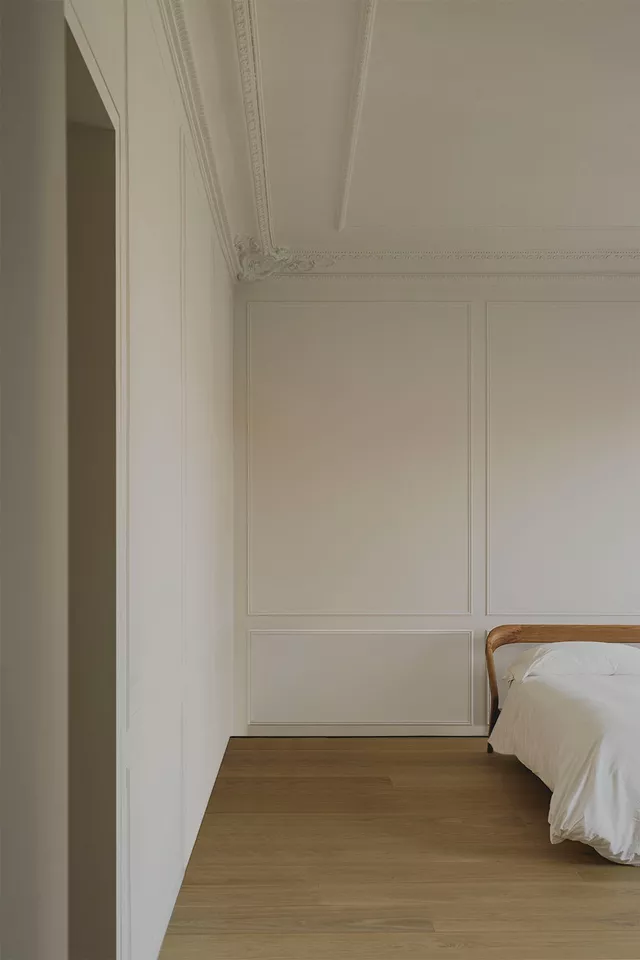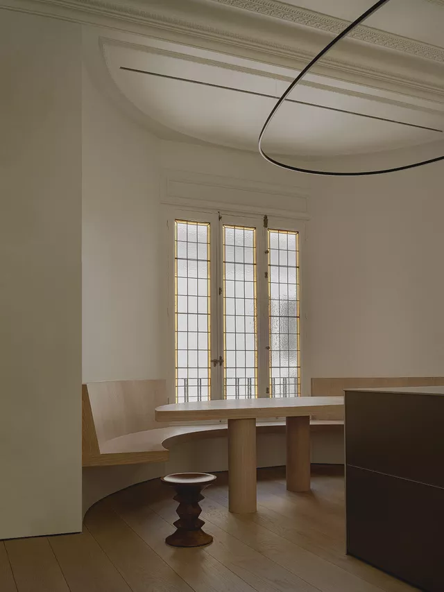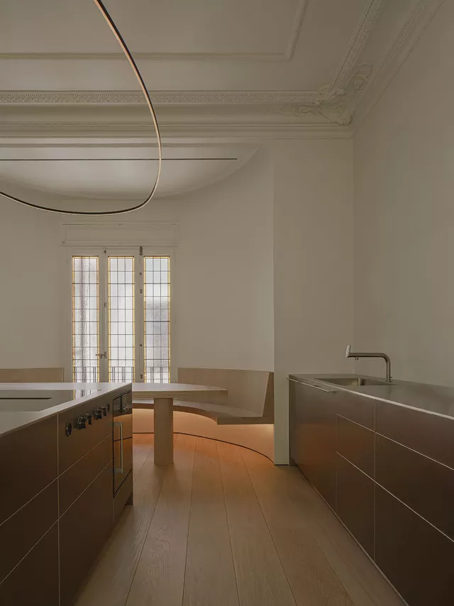 The layout makes the most of the building’s configuration, with rest areas facing the intimate garden space to maximise the quiet, natural lighting, and ventilation the environment provides. Common areas, meanwhile, face the main façade with views of the Madrid skyline, creating large-scale open spaces that replace the original corridors and converge on a kitchen that serves as a nucleus between the two sections.