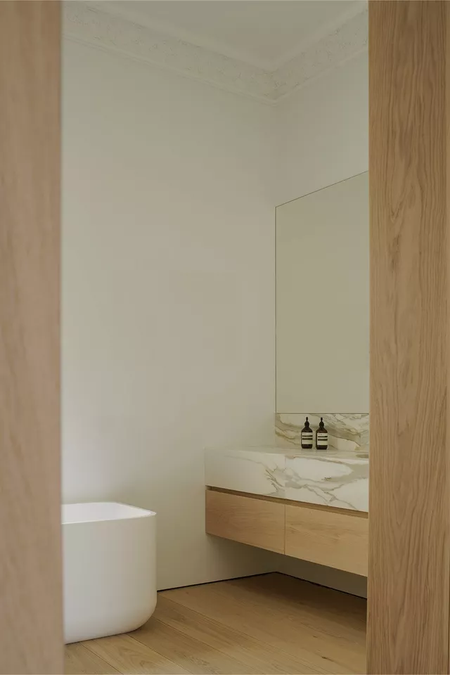 Once this historic character was reinstated, the interior was balanced with custom contemporary details using noble materials like solid wood, marble, and stainless steel.