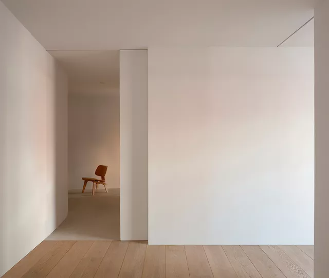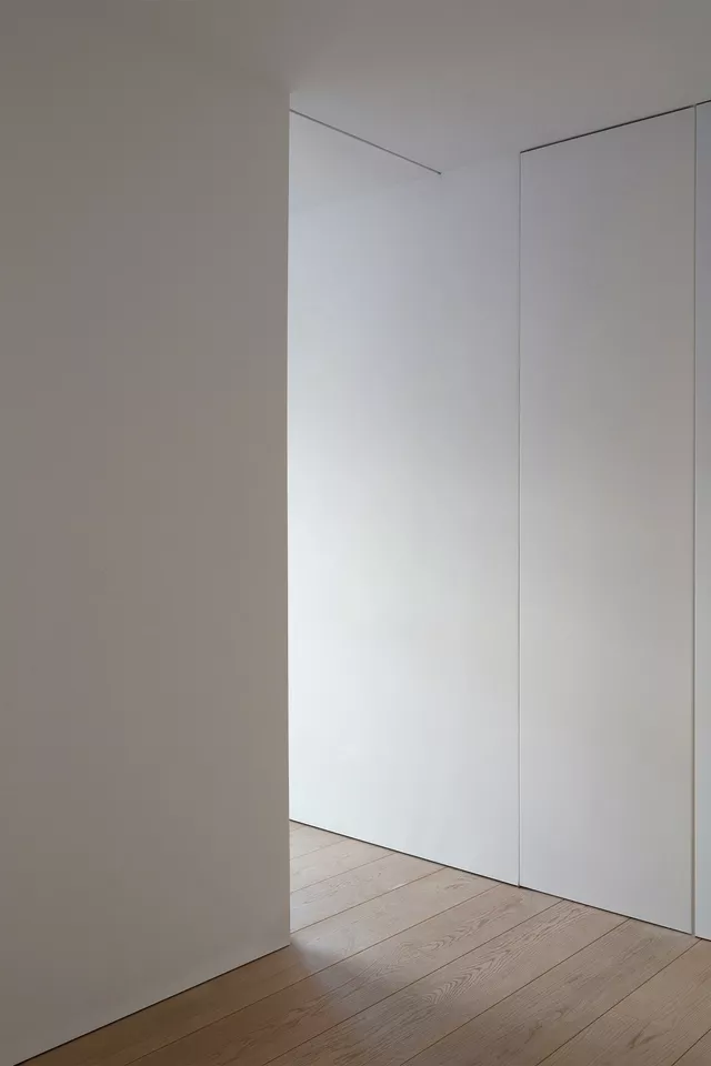 The introduction of curved geometry in the dividing elements helps break the perspective in transit areas, which are sufficiently ample and capacious to become useful spaces where even small domestic lounge corners can be set.